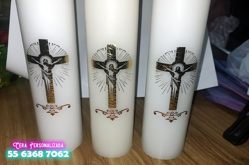 Cirios personalizados en tonos metalico dorado, en alta calidad.